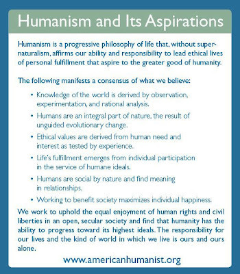 Secular Humanism is a belief that humans are responsible for their actions without the presumption of divine intervention or the surrender to fate. Humanists are moved by the human condition and feel society has a responsibility to work for the improvement of life without the interjection of superstition or mythology. Virtue and morality are completely compatible with this philosophy.