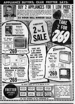 At first, Ollie Fretter played it straight as an owner/pitchman, but to distract his potential customers from the mind-numbing repetition of his commercials, he began hamming it up with all sorts of silly promotions like dressing as various characters. Sometimes, he would appear as a Gypsy violist, a mountain man, George Washington on President's Day, Uncle Sam on the Fourth of July, Johnny Cash, or Mother Nature. He would do almost anything to sell a refrigerator, a vacuum cleaner, a television, or a stereo system.