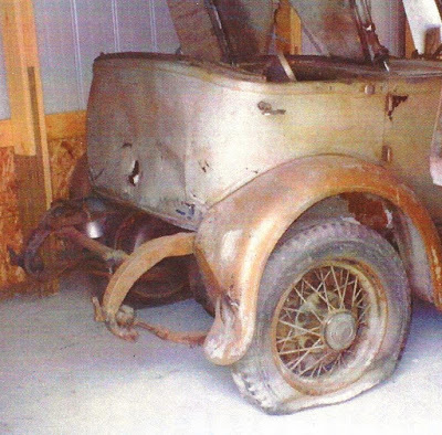 After Bill removed the clutter around and on top of his garage find, he rolled the car out onto the driveway and into the sunlight to get a better look. The Phaeton's original colors were blue with black fenders, but at some point the car underwent a hasty do-it-yourself paint job. Bill also discovered that the car had a smashed fender, other rear end damage, and several bullet holes in the aluminum body work. After rummaging through the limo's interior, he found a canvas bag from the Federal Reserve Bank of Chicago in the back seat.