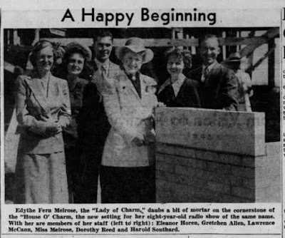 Edythe Fern Melrose, Detroit radio station WXYZ's Lady of Charm, and her business executive husband, Forest U. Webster, formed their own radio and print advertisement production company called House O'Charm Studios in 1941. This shrewd move put Edythe on a firm business footing which was rare for a woman of her time. Together, she and her husband produced her popular women's radio program and also made commercials for many of the products she used and recommended on her show. The Lady of Charm's seal of approval was money in the bank for advertisers, and sponsors were lining up to get her endorsement. It is difficult to overestimate her influence over women consumers in the Detroit area in the 1940s through the 1950s.