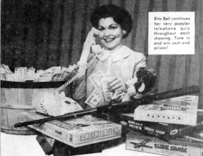 Rita Bell became the darling of Detroit daytime television, known for her sunny disposition, bright-eyed smile, and pleasant voice. She was genuine and charming. Her studio set was simply a huge, telephone dial prop hanging on the wall behind her and a table with a working telephone on it. Rita's hairstyle changed with the season as often as the telephones she used. The Prize Movie theme song was Al Hirt's catchy Cotton Candy.