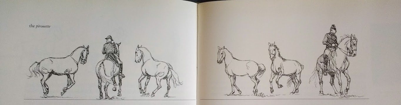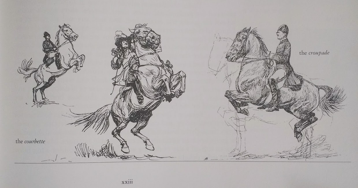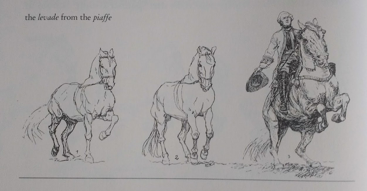 Levade under saddle.For ease of reference, I've included definitions of the various movements below. These are sourced from Wikipedia's article "Airs Above The Ground", but most classical dressage manuals will provide similar, if not identical, information. All sketched images are done by Ludwig Koch, and have been sourced from Lipizzaner: A Story of the Horses of Lipica, by Dr. Milan Dolenc, of which I own a copy (I took pictures of the sketches for you, using my mobile device)."The pesade and levade are the first airs taught to the High School horse, and it is from these that all other airs are taught. In the pesade, the horse raises its forehand off the ground and tucks the forelegs evenly, carrying all weight on the hindquarters, to form a 45 degree angle with the ground.