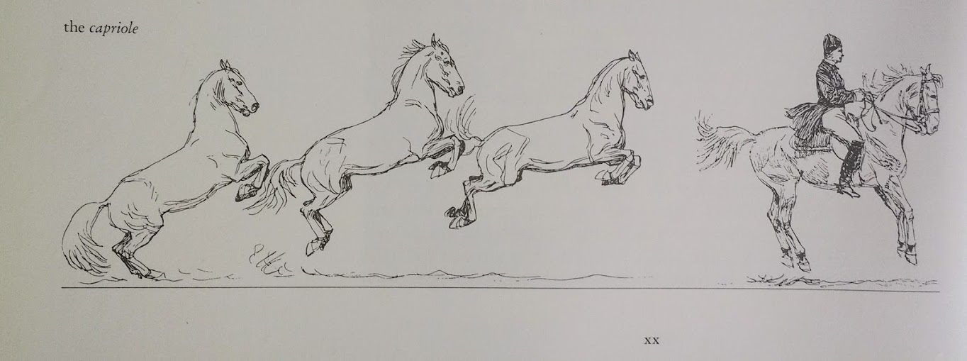 Capriole under saddle in action.The remnants of those techniques are preserved in the militaristic discipline with which horsemanship is taught to both equine and human pupils at the Spanish Riding School in Vienna, Austria.For those who aren't familiar with classical dressage, describing a horse's movements with terms more complex than jog or gallop may prove challenging. So when portraying a capriole, for instance, how exactly does one proceed? It is a rear, a leap, a kick, but to witness them performed in flawless transition is to realize the power and force behind the act, and realize that it is so much more.
