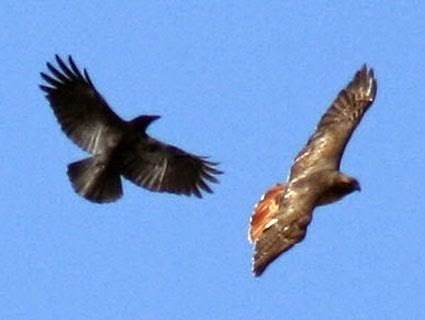 This time of year, with no nests or juveniles to protect, it's rather curious to see crows being hostile. Defending hunting territorial lines, perhaps. Or did the hawk steal their roadkill, maybe?