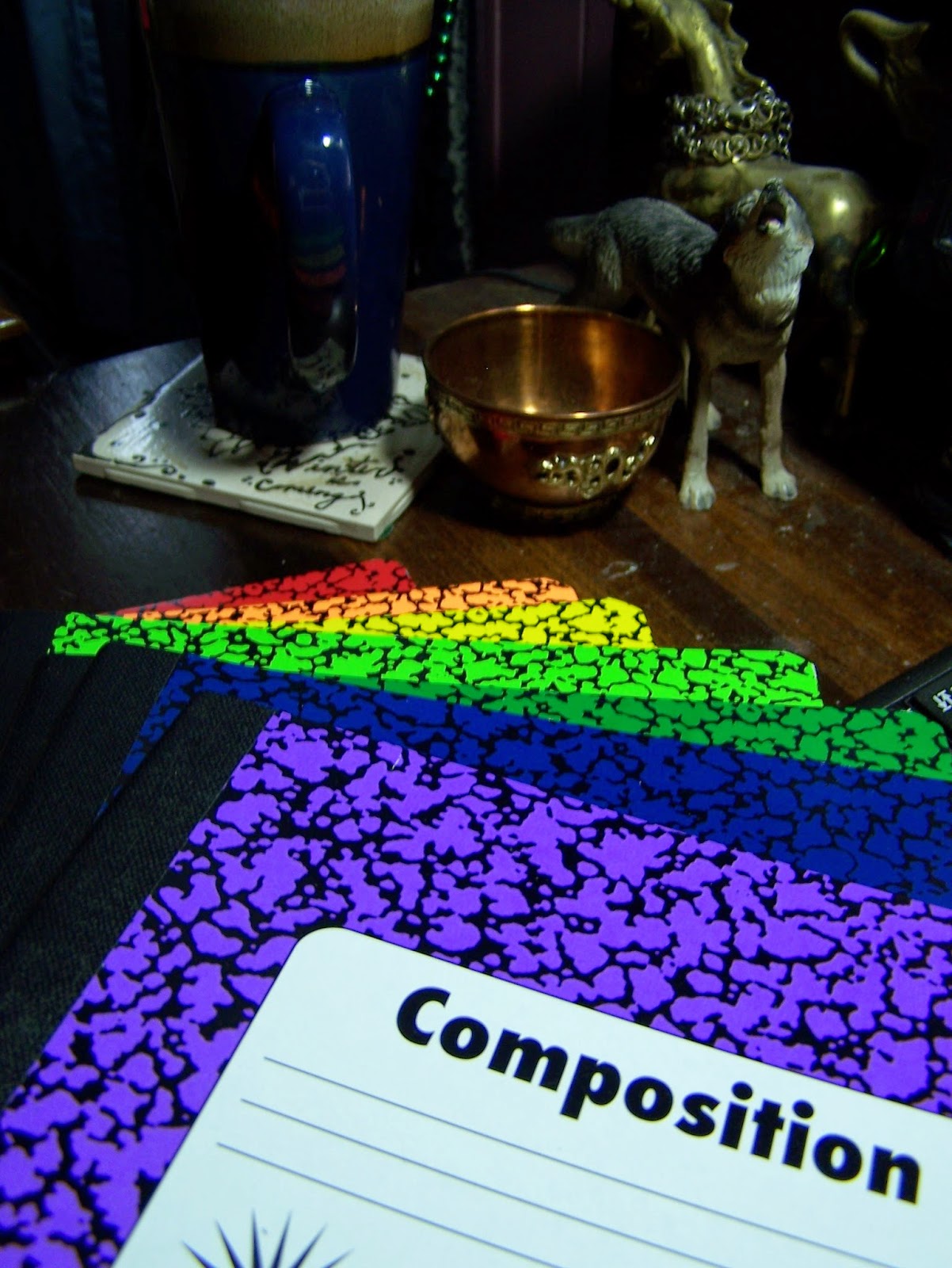 I have a collection of smaller Moleskin notebooks hiding about for potential giveaway material in the distant future, their content the arduous working material of a few different WIPs. These, though. The composition notebooks are my workhorses. Clamped with butterfly clips to bookmark content no longer needed, standard paperclips to separate notes for different projects that inevitably lump together in the same space. Inevitably, because I only carry two of them, and one is devoted to the tome of a book I'm working on, so all the others stream together in the overflow one. Stream together, because as much as I do try to focus my energies on a single story at a time, I'll have ideas for plot points, thoughts about character backstory or development, and it comes out almost stream of consciousness, all over the place.