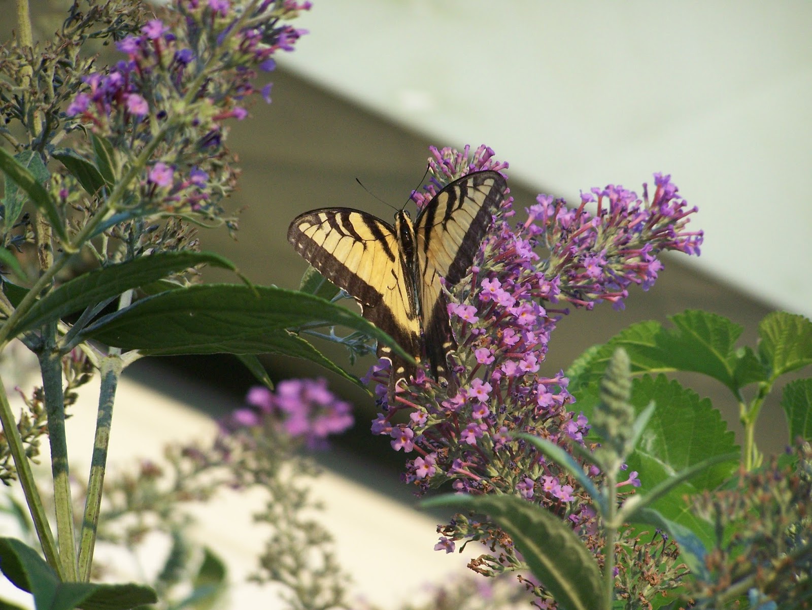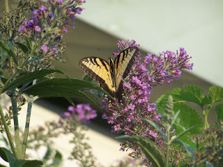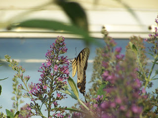 There haven't been many instances for me to catch actual butterflies in the garden. There were three of them, the other day. All adults, two of them with colors so faded and wings so damaged and battered that I was astounded they were still flying. The one I recognized from a few days prior; that time, though, it had been alone. Guess it loved the bush so much it came back and brought its buddies.