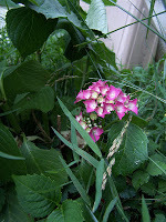 Apparently there isn't any aluminum in my soil, because that's some wonderfully intense pink going on there. Which is perfectly fine with me. And this gives you an idea of how I weed my garden--I don't. Errant grass is allowed to grow, along with dandelions and whatever else. The only plant I remove is the poison that occasionally crops up. All the others are left to supply the natural wildlife with food sources, be they butterflies and moths, bees, rabbits, or birds.