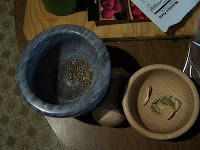 Five or six pods went into the marble mortar. They had a faintly greasy texture when I pulled the seeds from inside them and discarded the skins. That would be cardamom oil, which is used in tea a great deal, specifically chai and Bengal Spice blends. They must not use very much, because I can't begin to imagine how expensive cardamom oil must be.