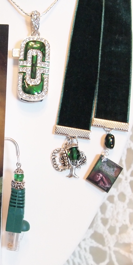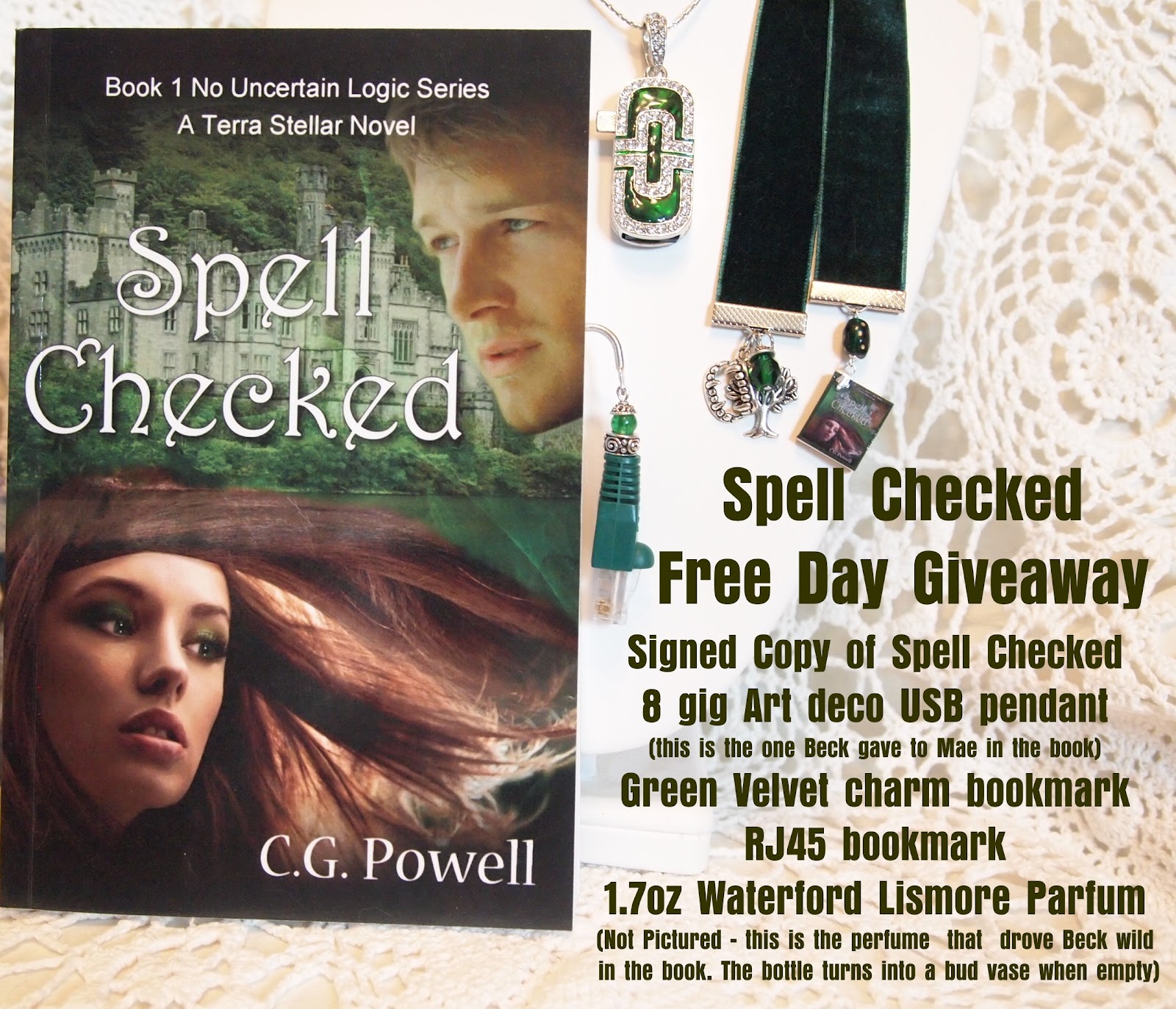 I’ve got a great contest going just for the occasion, and it mostly stuff from the book, like the USB pendant Beck gave to Mae, and the perfume (Lismore by Waterford) which comes in a lovely crystal bud vase. Plus a signed copy of Spell Check and a couple of unique bookmarks!