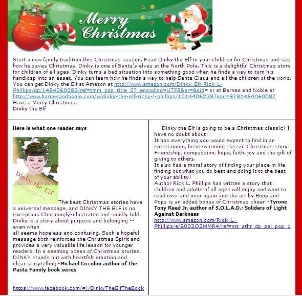Get the book Dinky the Elf at any online bookstore. Here are links to it on Amazon.com https://www.amazon.com/Dinky-Elf-Ric…/…/ref=as_sl_pc_ss_til… Here is the link to it at Createspace https://www.createspace.com/5011488 Here is the link to it on Barnes and Noble http://www.barnesandnoble.com/w/dinky-the-elf-r…/1014406238… and this is the link to it on Joseph-Beth http://www.josephbeth.com/Products/128135-dinky-the-elf.aspx