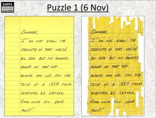 "Today's troops often confiscate the remnants of destroyed documents in war zones, but reconstructing them is a daunting task. DARPA's Shredder Challenge called upon computer scientists, puzzle enthusiasts and anyone else who likes solving complex problems to compete for up to $50,000 by piecing together a series of shredded documents."