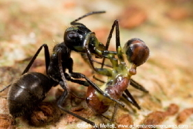 The best photo I found on this phenomenon was the one above; it's not obvious to me who is exploding and who is getting slimed. The black ant looks most like a carpenter ant, and since it's a certain species of carpenter that displays this behavior, I assume the little red guy is the one getting blasted. It really doesn't look like either of them has exploded.