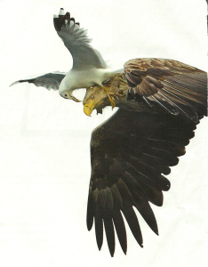 Good idea because actually the gull is not sitting on the eagle, it's attacking it. Apparently the gull is protecting its young. Here's the interesting part: "Some gulls also defecate or even vomit on the predator for good measure." Go daddy.