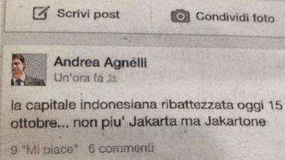 Il presidente della Juventus dà il benvenuto al nuovo proprietario dell’Inter parlando su Facebook di un nuovo nome per la capitale dell’Indonesia. E il web si infiamma.