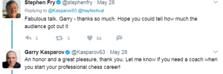 Kasparov’s next book is Deep Thinking: Where Machine Intelligence Ends and Human Creativity Begins. (May 2017) It details his matches against Deep Blue, his years of research and lectures on human and machine competition and collaboration, and his cooperation with the Future of Humanity Institute at the University of Oxford. He says,