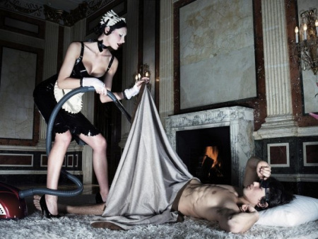 How about the woman? Is she really the hired help? If so, just what exactly is she hired to do? Could she be working undercover in a faux fur rug smuggling ring? Or maybe she’s auditioning for a role in the 50 Shades of Grey movie.