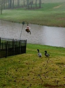 I'm sure that our neighbor didn't have this scene in mind when she put the bird feeder in her back yard. I suspect that she intended for birds to fly in to eat from the feeder and not squirrels or ducks that waddled up from the pond.