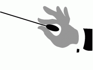 The Composer looks on with a smile as the Conductor leads the orchestra. The new member of the group notices right away that the Conductor is not only leading the entire group but is also patiently showing him how to play his instrument one-on-one. Even though he is very awkward and clumsy, the Conductor smiles and encourages him to continue.