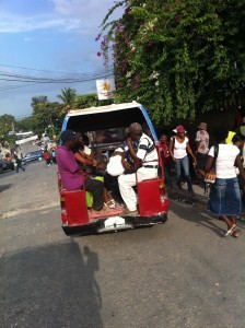 As we made our way through the crowded, narrow streets of Port au Prince, I couldn't help but notice these small pickup trucks with toppers on them everywhere I looked. I could see people getting in and out of the backs of the trucks all along the way.