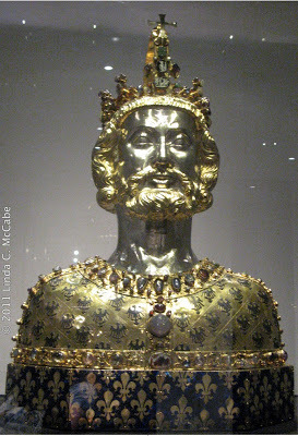 A reliquary of Charlemagne containing his head. This is found in the cathedral treasury in Aachen, Germany.