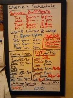 I don't have everything scheduled. And this schedule is from before I switched some of my courses around. Whether I'm studying online or in an actual class, I just list it as school time. And I don't list everything. Just the big blocks, School, Work, Family, and Gym. Both work and Gym are JFW times, just f*ing write and just f*ing workout, respectively. For some reason, having more stuff to do? Just motivates me. I did give myself the option to take one day a week off from the gym/workout schedule. And I read for pleasure at bedtime every single night. Some nights I get in a few hours of fun reading. Some nights I open my book and promptly close my eyes, lol. Mostly though, I'm having a blast. I'm doing what I love, and learning how to understand the business end of it at the same time. I don't know that this kind of controlled chaos would work for anyone else, but for me? It's good times. The blocks of writing time keep me fed creatively. The workouts clear my mind and strengthen my body, and the Family time builds relationship with my kidlet. School helps me to be better at all three.
