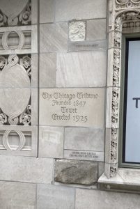 When McCormick began constructing his Tower in 1923, he decided to expand his collection of historical rocks and incorporate them into the structure of the building. He sent a memo to his foreign correspondents instructing them to acquire “stones about six inches square from such buildings as the Law Courts of Dublin, the Parthenon at Athens, St. Sophia Cathedral, or any other famous cathedral or palace or ruin—perhaps a piece of one of the pyramids” and send them to Chicago.