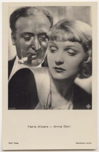 When the Nazis came to power, “the blond Hans,” as he was known, was so popular that the Nazi regime overlooked his long-standing relationship with Jewish actress Hansi Burg for several years.**** Despite the fact that he frequently opposed the Nazis, his acting career flourished under the Third Reich. Instead of playing overtly Nazi heroes, Albers took roles as heroic Germans of the past and romantic leads. After the war, he moved successfully into roles as wise, fatherly figures.