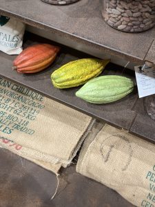 The cacao tree is native to Central America. It only grows in tropical areas with a temperature above 60 degrees Fahrenheit and year round moisture. In its raw state the cacao bean grows in pods on the trees known botanically as “theobroma cacao,”from the Greek word for “food of the gods” and the Mayan word for the bean itself.