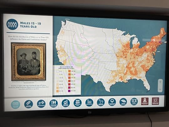 An excellent video showing how nineteen century armies maneuvered field artillery, with a digression into the number of horses used and killed in the war. (I was reminded of our visit to a museum dedicated to the engagement known as the Falaise Pocket in Normandy in World War II where we were told that it was two years before people could plant crops agains because the ground water was so polluted with the corpses of men and horses. I’ve said it before, and I’ll say it again: war is ugly.)An important component of the soldiers who fought for the Union at Wilson’s Creek were Germans from Saint Louis who had immigrated to the United States after the revolutions that swept Europe in 1848. The ’48ers had come here in search of freedom and were violently opposed to slavery. I had learned about this on my last visit to the battlefield, but it hit me harder this time, perhaps because I’ve spent the last few years deep in Nazis and American Nazi-supporters.With a few colorful exceptions, like the various Zouve units, we think of the armies dressed in uniforms that were, well uniform: blue for the Unions and gray for the Confederacy. In fact, many men fought at Wilson’s Creek in the same clothes they wore as civilians, making it hard to tell friend from foe on the battlefield. Even more confusing, at least one existing Union unit had gray uniforms.A interactive map that displayed demographic and economic data about the United States in 1861 down to the county level. I am a sucker for historical maps—after all, history occurs in both time and space. This one was absolutely fascinating. Some of the topics were expected: where cotton was grown for instance. Others were surprising: the distribution of what the map maker calls the “equine population”. (This did make me wonder how they got the information. ) I could have spent a lot more time with that map, and may on future visits.In short, a worthwhile stop if you are in the area. I love the fact that the National Park Service is beginning to address the parts of history that most of us weren’t taught in school. Plus, maps.