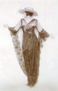 Lucile, then Lucy Wallace (née Sutherland), entered the “rag trade”in 1890 because she was desperate for money when her alcoholic husband, James Stewart Wallace, abandoned Lucy and their daughter. Lucy moved in with her mother and she began supporting herself as dressmaker. When one of her dresses was a hit at a weekend house party, her career took off. In 1894, after divorcing James Wallace, that nice little dressmaker Lucy Wallace turned herself into the mononymous Lucile, owner of the exclusive Maison Lucile, which catered to a wealthy clientele that included aristocracy, socialites and stars of the film and stage, such as Lily Langtry, Ellen Terry, Sarah Bernhardt, Mary Pickford, and Irene Castle. A few years later, Lucile married, Scottish baronet Sir Cosmo Duff-Gordon. Already a celebrity as a couturier, her new title added additional cachet to her career.