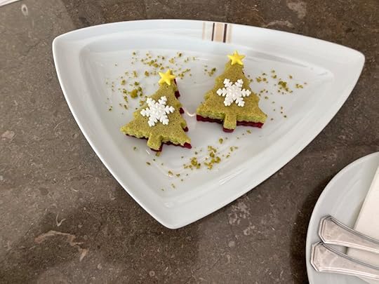It’s Christmas Eve and I am sitting in our hotel room in Cascais, Portugal, looking at a surprise Christmas treat the restaurant staff just delivered to our room. We have a little balcony with two comfy chairs, where it is almost warm enough to sit and stare at a gorgeous view of a gray and challenging Atlantic. We were afraid we wouldn’t get here because of the winter storms that disrupted holiday travel in the United States and we are counting our blessings.