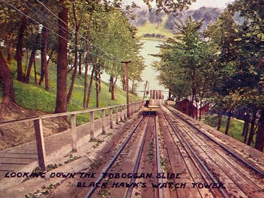 The most popular ride was called “Chute the Shoots”: the prototype for the toboggan slide rides that became popular in amusement parks across the country within a decade. Flat-bottomed boats ran on greased wooden tracks from the top of a steep bluff down to the Rock River, gathering speed along the way. (Up to 80 miles an hour according to one source.) When the boat near the bottom of the track, the ride’s operator released the boat from the tracks, which then skimmed over the water. The conductor would pole the boats back to the bottom of the Chutes, where they were hauled back up using electricity from the street car lines. Personally, I think it sounds terrifying. But then, the Tilt-a-Whirl is the wildest ride I’m willing to go on.