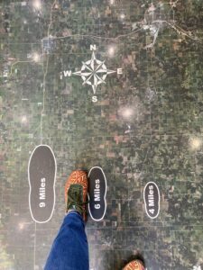 In fact, the vistors’ center had all of that, including what turned out to be a detailed topographical map of the area around the lock and dam on the first floor of the center, with a clever way to display the map’s scale. (Turns out I have a six-mile foot. Who knew?)
