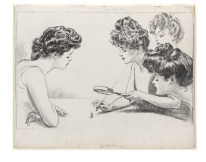 Charles Dana Gibson (1867-1944) was an important illustrator in the Golden Age of American illustration. He sold his first illustration in 1886 to Life magazine,* where his works appeared every week for thirty years. Soon his drawings appeared in every major American magazine, including Harpers’ Weekly, Scribners and Colliers. He illustrated books, including American editions of Charles Dickens’ novels, The Prisoner of Zenda, and Gallegher and Other Stories by swashbuckling journalists and adventurer Richard Harding Davis.** in 1918, he became first editor and then majority owner of Life.