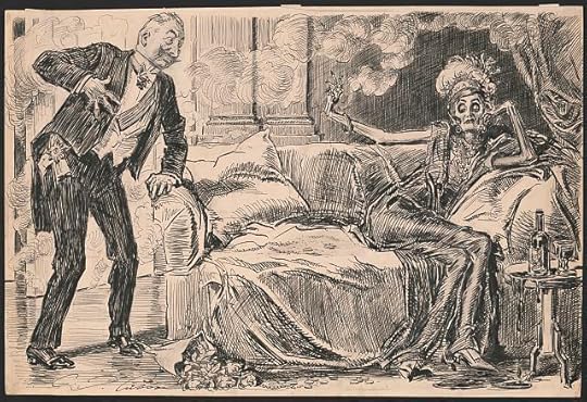 In addition to leading the Division of Pictorial Publicity, Gibson also created satirical ant-German political cartoons for Life magazine. One of the most powerful was “And the Fool, He Called her His Lady Fair,”** which was published on May 7, 1917, only weeks after the United States entered the war. In it, Gibson presents war as a skeletal woman being wooed by a male figure who bears a clear resemblance to Kaiser Wilhelm II. Wreathed with cigarette smoke, dripping with jewels, wine dripping in blood-like puddles at her feet, she is long way from the wholesome Gibson Girl.