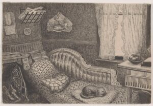 The scholarship was a really big deal, but it wasn’t enough to live on. She was forced to spend much of her time on commercial work, including fashion illustrations*** and painting lampshades, plus occasional stints as a model. At the same time, she was developing a distinctive style of drawing and lithographic print making. She focused on interior spaces, rural landscapes, and architectural structures, using strong tonal contrasts and twisting contours. The result was modernist in style, with fairy tale overtones. In 1925, she began to enjoy success in the art world with the first of several solo exhibitions. (Her work sold out.)