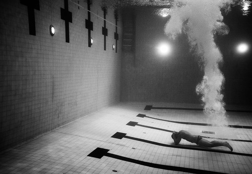 A diver has a very personal moment of dejection at the bottom of the pool during the 2012 CCCA Swimming and Diving State Championships at East Los Angeles College Swim Stadium on Thursday, April 26, 2012 in Monterey Park, CA. This image was awarded a Gold medal in the Sports Feature category from the 2012 College Photographer of the Year competition. (Suzanne Tylander)