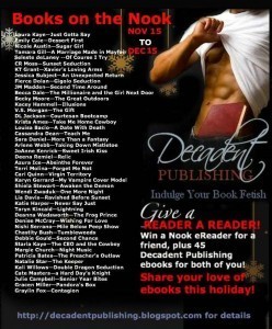 Wow. Here is the Grand Buddha of giveaways, people. Not only do you get a Nook, you get it filled with 45 books from Decadent Publishing (the Nook is available only to US residents, but the books can be emailed anywhere).