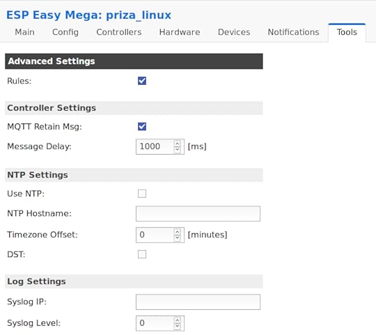 Priza știe printre altele de NTP, îți afișează uptime-ul, poate stoca fișiere (habar n-am în ce cuantum), salva log-urile pe un server remote și altele. De menționat că la ”Hardware Settings” am făcut următoarele setări: