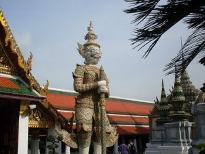 The bulk of the morning tour was a walk around the Temple of the Emerald Buddha. The whole complex was a fantastic display of architecture, rich in colour with numerous statues and buildings immaculately put together. The downside of the tour was the heat. It was around 80% humidity and the sun was out most of the time so we were all sweating. Even poor Charlie was resorting to wiping his forehead every few minutes with a useful handkerchief. He didn’t have any spares for the rest of us, which was a shame.