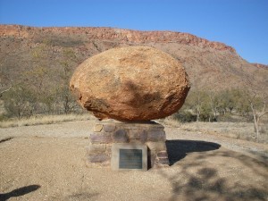 Outside Alice Springs we stopped off at the John Flynn Memorial. Flynn was the founder of the Flying Doctors Service and had specified on his death that he wanted a particular kind of stone to adorn his grave. This was at a time when the Aussies didn’t understand the Aborigine culture and customs, and the stone they used for Flynn’s grave was known as a ‘dreamstone,’ sacred to the Aborigines. They, of course, wanted it back and for years the debate raged on about ownership. Eventually the courts interfered and a compromise was reached. The original stone was returned to the Aborigines who agreed on another stone to be used for the memorial.