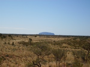 Our last stop was a lookout point offering distant views of both the Olgas and of Ayers Rock. It was a bit of a walk to get there but mercifully this path was more even. The annoying characteristic of the Northern Territory was in evidence once again – the flies. Any one of us that left the coach would come back with a dozen of the pests on their back. Even insect repellent had little effect against this lot.