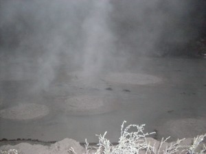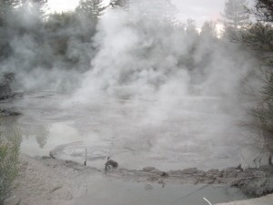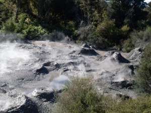 Before Rotorua, Cameron took us to his ‘secret mud pool.’ It was more than just a pool of mud thankfully. The heat beneath the ground made the pool resemble a bubbling cauldron from some children’s fairy tale. The steam was rising from the surface as were thick, squelchy bubbles, which, on bursting, fired small bits of mud into the air. It wasn’t an overly pleasant scent but it was a must for the photo album.