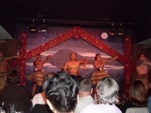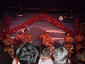 Before the meal our hostess, who was also part of the show, took us through the Maori greeting. A Korean couple that were the only representatives from their country were given the honour of meeting the Maoris. A warrior appeared on stage, did some fancy moves while twirling a large spear, before placing a leaf on the floor. The Korean man was then invited to pick up the leaf before shaking hands with the Maori warrior and they concluded by touching noses twice. With that the ceremony of welcome was over.