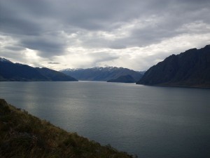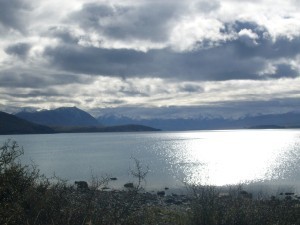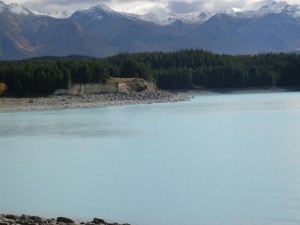 Passing through Mackenzie Country we stopped off at Lake Tekapo for the obligatory snapshots. The water in New Zealand’s lakes and rivers is almost turquoise in colour, the influence of the glaciers. On the horizon we could make out the Southern Alps and, most notably, Mt. Cook. Each of the peaks was tinted with snow and the clouds hung lower than the mountain tops and seemed to be descending down the sides. Our next stop was at Lake Pukaki for more photos. New Zealand’s scenery was getting better.