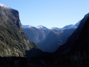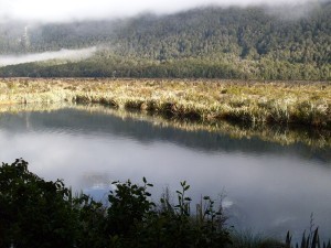 The mist was still around but only served to augment the quality of the snapshots. We were so high up that some layers of mist appeared to be almost touching the ground. Our first stop was where the road made between the Earl Mountain Range and Livingstone Mountain Range. The Earl Mountains were enveloped in mist but just visible were the snow-tipped peaks above the thick layers. The Livingstone Mountains were covered in trees, a characteristic that was typical of this area and along Milford Sound.