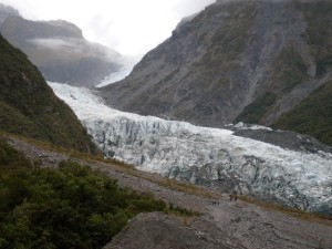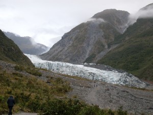 Before reaching the town of Fox Glacier, we took a detour to have a look at the glacier itself. We were given around fifteen minutes to have a wander and take some photos. A notice detailed two journeys – one was to a hill offering a good, but distant, view of the glacier which took five minutes, the other was all the way to the glacier itself and took an hour. When the tour group made the short walk to grab a picture, one of our party – Alison – wandered farther ahead than any of us and kept going!