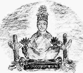 “Over a hundred feet from the entrance is a cross-hall, several hundred feet long, in which was found the idol, or image, of the peoples god, sitting cross-legged, with a Lotus flower or Lily in each hand. The cast of the face and the carving shows a skillful hand, and the entire is remarkably well preserved, as is everything in this cavern. The idol most resembles Buddha, though the scientists are not certain as to what religious worship it represents. Taking into consideration everything found thus far, it is possible that the worship most resembles the ancient people of Thibet. Surrounding this idol are smaller images, some beautiful in form, other crooked necked and distorted shapes, symbolical, probably, of good and evil. There are two large cacti with protruding arms, one on each side of the dais on which the god squats. All this is carved out of hard rock resembling marble.