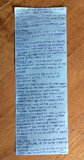 Again, these are words that I have come across in the course of my reading. My self-made paper bookmarks migrate from book to book in a random way as I finish one book and start another; the fact that I have several books going at any one time means that the bookmarks truly make a random journey, usually over the course of several years each. They can be novels or nonfiction works.