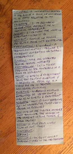 To give you an idea, I thought I would share the contents of a recently completed bookmark. Most of the words were not new to me in the sense of never having seen them before. My main criterion for adding a word is that it not be in my active vocabulary. I ask myself, “Could I use this word in my own writing right now?” If I lack confidence about that, then I add the word and its definition. When a word has multiple senses, I usually just write down the sense in which it is being used in the book where I found it.